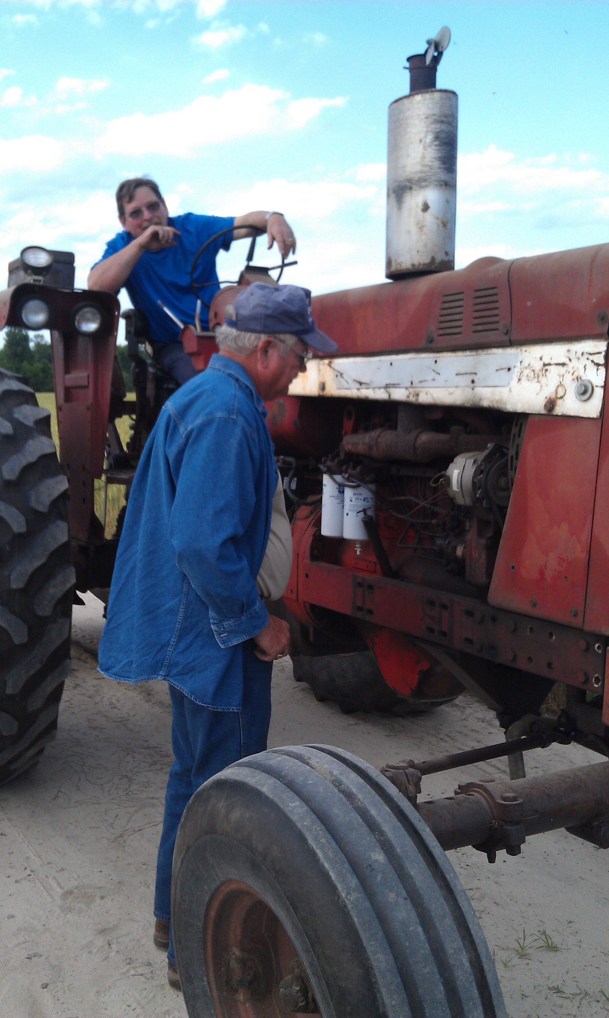 On one particularly fine day in May, we fired up the International Harvester 856 (AKA the hussy) to take it across the street to bush hog around our neighbor’s pond. It fired right up, made it across the street to the back of the farm, and began to run out of power. John turned it around to come back down the dirt road and got about fifteen feet down the 1/3 mile road. The hussy had stopped completely. He let it set for about five minutes and fired it back up. He started forward again. And made it about another fifteen feet. Another five minutes, another fifteen feet. It looked like the half-mile trip home would take several hours. This is when a cell phone comes in handy.